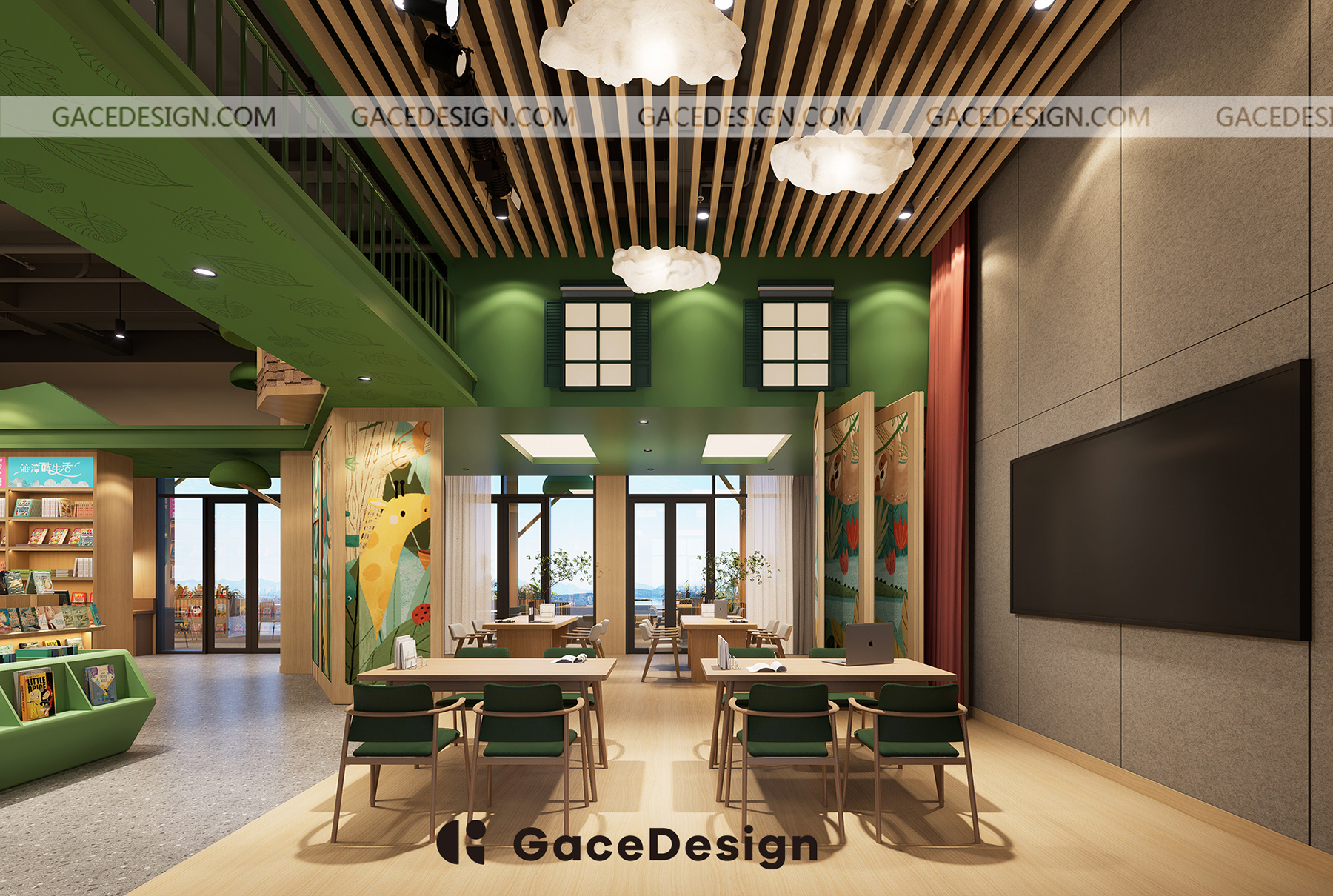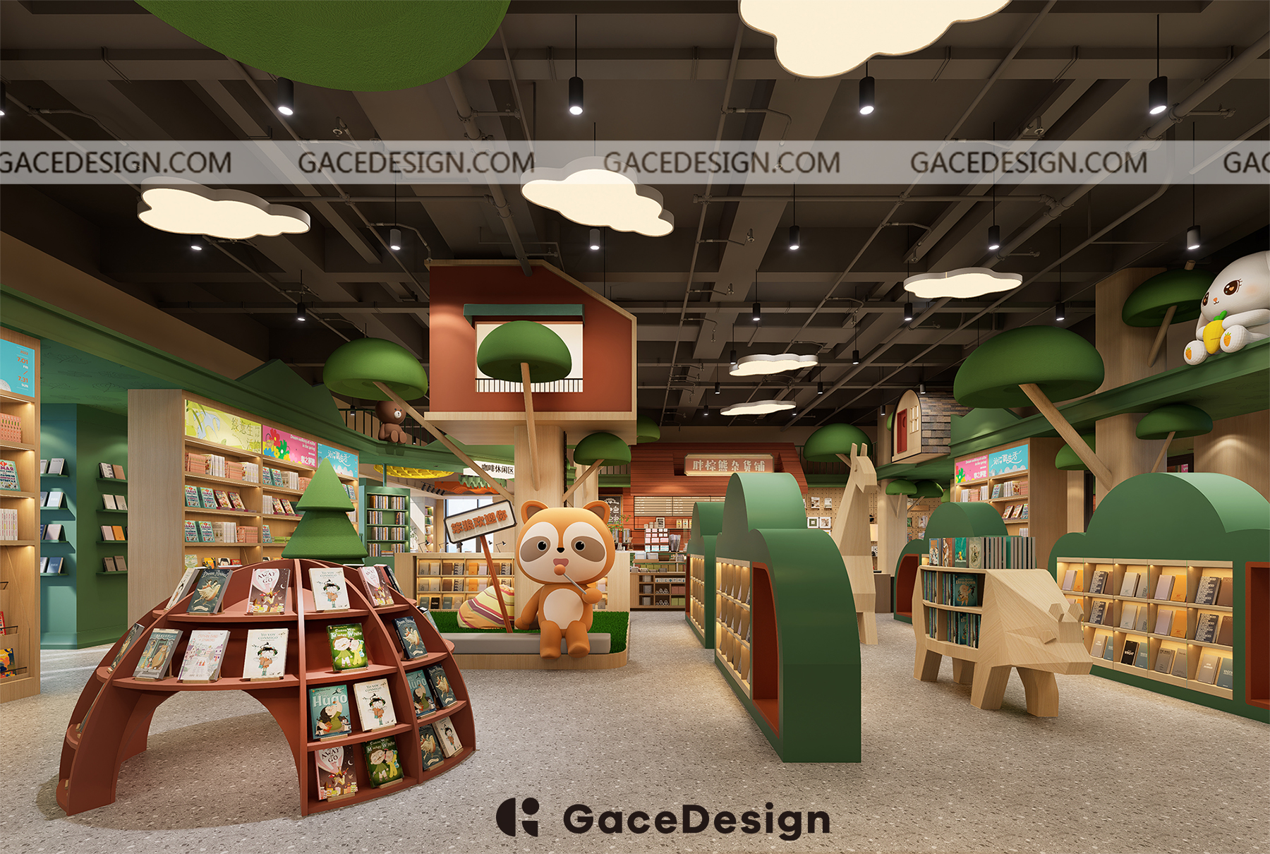 ?設計師希望給孩子更多類似森林的行走路徑,通過環境引發孩子自主尋找書的樂趣。以“室內建筑”為設計理念,鋪設綠色草坪,在室內開辟一處獨特的“森林仙蹤”場地,設計手法突出項目層高的優勢。功能區猶如散落在森林的獨棟小屋,樓上樓下,院內院外,皆是孩子的專屬天地。