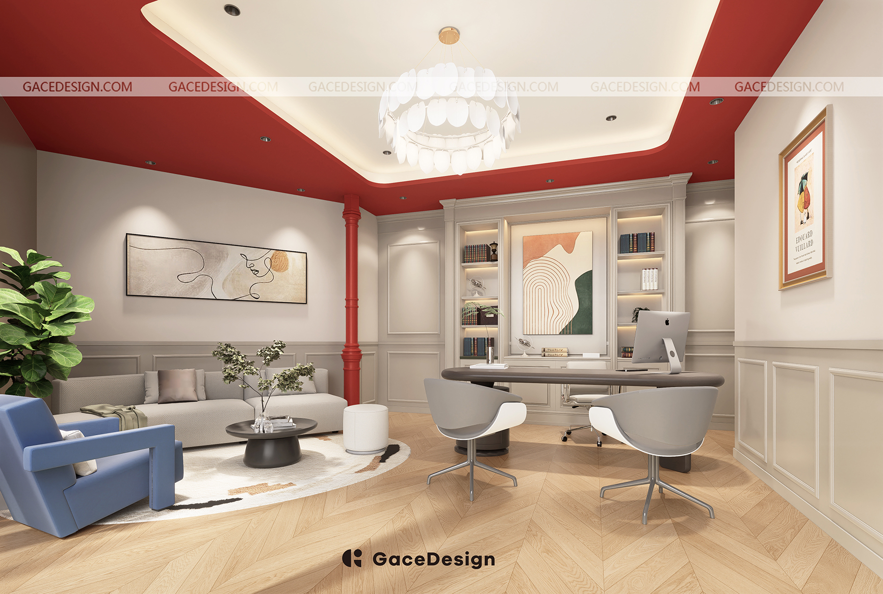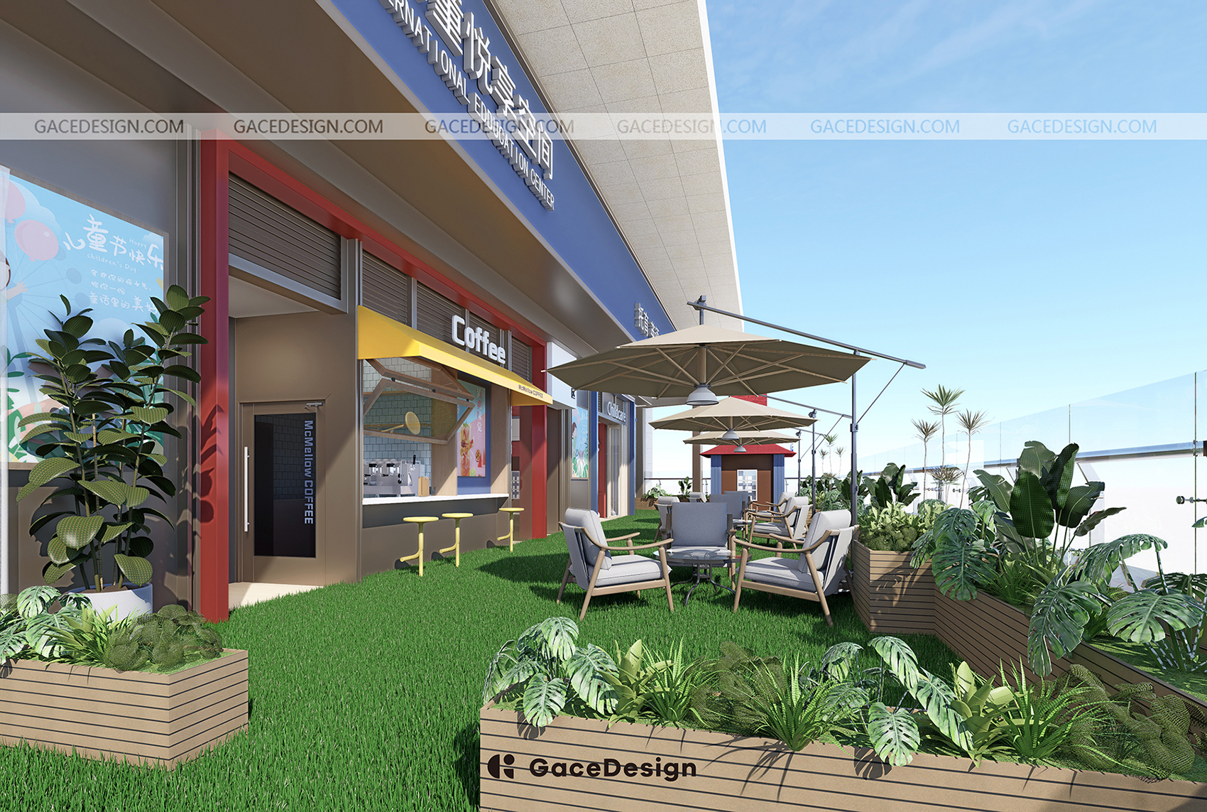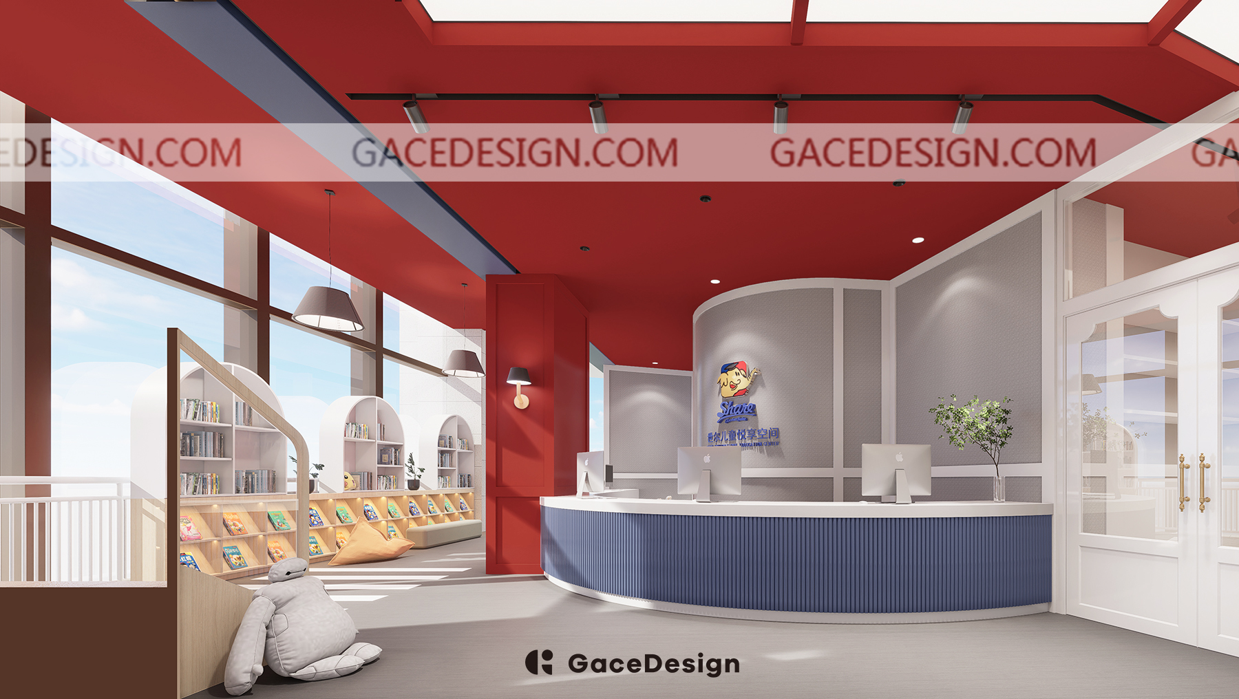 ?本次GaceDesign集合設計負責的是深圳龍華壹方天地校區,室內實際面積約440㎡,室外約207㎡,包含了6個教室。新的校區延續第一家校區的主色調“紅藍白”,強調沉浸式的美式氛圍。本次校區還特意設計了多個區角,分別有咖啡吧,多個休息區角公共空間。