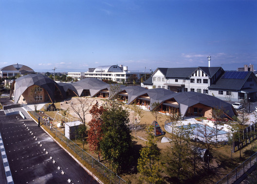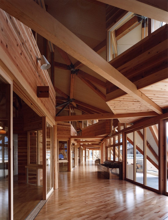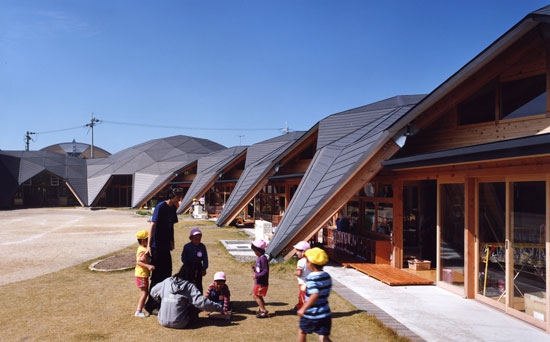 maihara幼兒園它位于日本滋賀縣,它的周邊都是一些新建的住宅區(qū)。混凝土的盒子由連續(xù)的木頭屋頂鏈接為一體,屋頂用連續(xù)的三角形的平面構(gòu)成;它的結(jié)構(gòu)的強(qiáng)度和形狀的連續(xù)性有很大的自由度。屋頂使用2.5米長的木梁和六角形的金屬(接頭)配件,工廠預(yù)制,現(xiàn)場裝配。木制桁架和混凝土盒子組合出各種各樣的結(jié)構(gòu)表現(xiàn)效果。