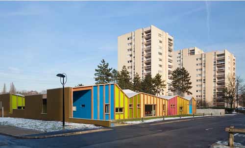 Epinay幼兒園在法國巴黎附近一個(gè)名叫埃皮奈蘇塞納爾的小鎮(zhèn),幼兒園附近坐落的都是上世紀(jì)七十年代的經(jīng)典建筑,由一些5層長條形樓房和12層小高層組成,都是些高大、厚重的矩形體量。雖然這些高樓很有特點(diǎn)但是基本上相同的建筑限制了周圍公共開放空間的景觀,開放空間看上去滿眼都是抹灰混凝土砌塊。最近該處房產(chǎn)在外表面得到翻新之后,盡管有點(diǎn)金玉其外的意思,但是應(yīng)該怎么樣去呈現(xiàn)出一個(gè)寧靜的畫面這是一個(gè)問題。