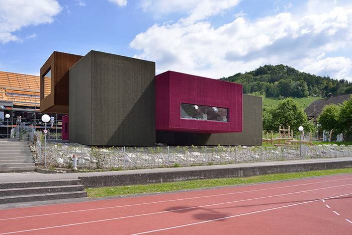 遙遠(yuǎn)的瑞士在鄉(xiāng)村一所小學(xué)的附近坐落著一座風(fēng)格獨(dú)特的幼兒園,遠(yuǎn)遠(yuǎn)看去就像是用幾個(gè)大箱子堆積起來(lái)的一樣,其表面種著有,草黃色、紅色和橄欖綠三種顏色的人工草坪形成了獨(dú)特的立面,使得幼兒園和鄉(xiāng)村中心的環(huán)境更加的和諧,相比冰冷的墻面柔軟的草坪墻壁更加適合兒童。