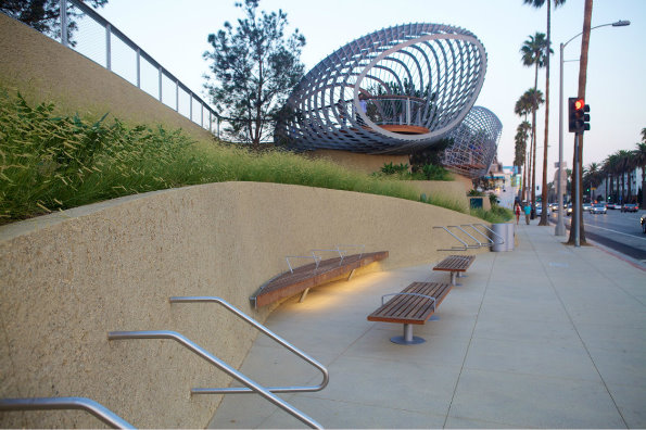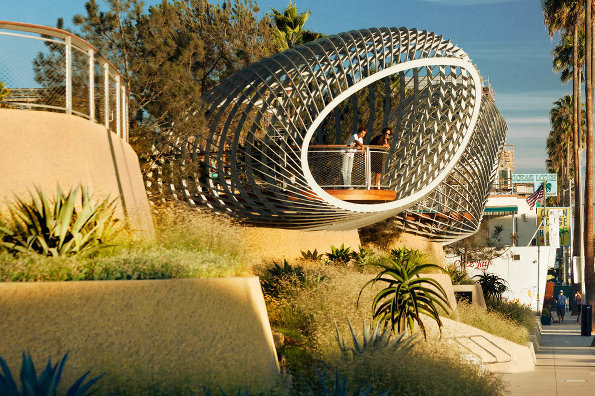 公園內(nèi)最吸引人注意的是造型新穎的觀景平臺(tái),離地平面約18英尺,曲線型網(wǎng)狀涼亭,就像個(gè)編織的橢圓形籃子,民眾可站在原木打造的平臺(tái)上,俯瞰一望無(wú)際的太平洋丶圣莫尼卡碼頭上的摩天輪與海灘上的熱鬧人群。