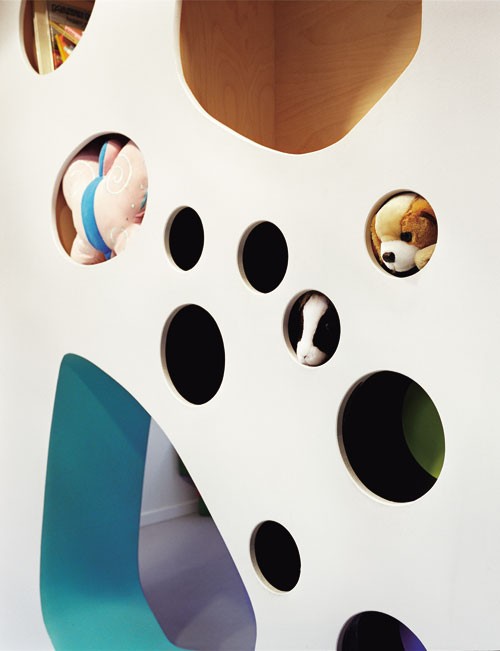 這些墻面包含多種用途——書架,抽屜,公仔秀,黑板,可以拉伸的家具、攀緣墻等等。