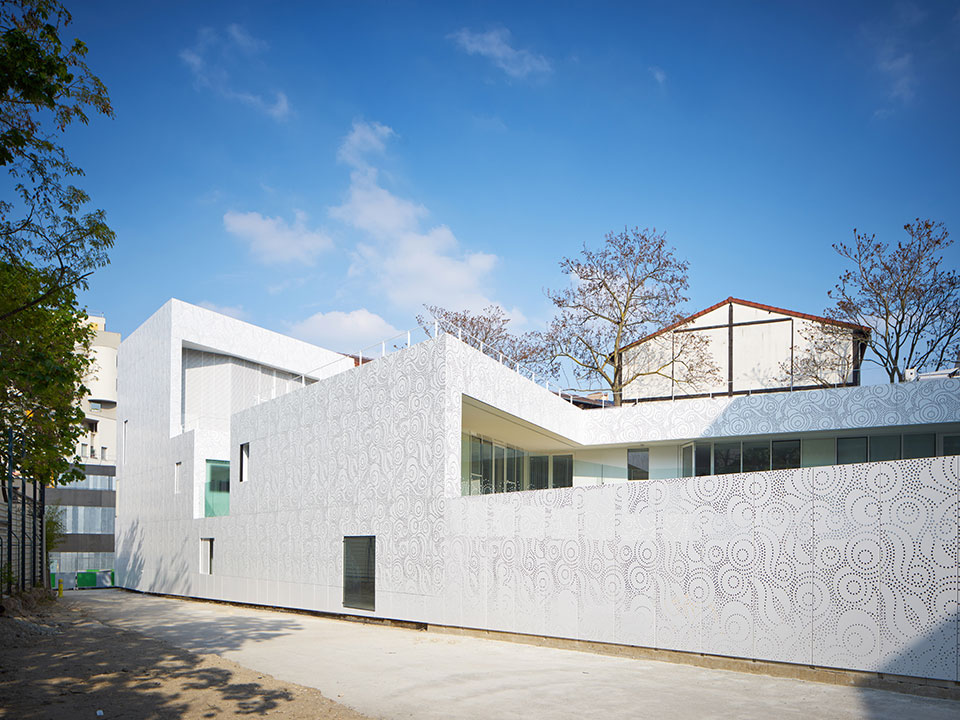 法國建筑事務(wù)所Avenier Cornejo設(shè)計的巴黎20區(qū)幼兒園建成,這所可容納66個孩子的幼兒園是一座獨特的建筑,為兒童提供安心的環(huán)境。建筑以混凝土為結(jié)構(gòu),滿滿占據(jù)著三角形地塊,并沿兩側(cè)邊緣開了三個內(nèi)庭院,為建筑提供充足的陽光與光線。建筑周身覆蓋有著美麗花樣的金屬穿孔板。這層金屬外表皮還覆蓋了部分窗戶,為其提供過濾的光,并在夜晚像燈籠一樣透光。傍晚來臨的時候,兩旁的路燈亮出詳和的燈光,好像都在刻意討好這所幼兒園。它就像一位非常漂亮文雅的姑娘,周圍建筑和路燈都是敗在它的石榴裙下的紳士! 此幼兒園的顏色和圖紋,與周圍建筑想必是那么與眾不同,一下子就能夠把人們的目光吸引住了。