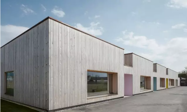 集合少兒設計機構分享:目前幼兒園正在準備向東北方向擴建,為了尊重原有建筑的設計并保持與它空間上的聯(lián)系,擴建部分與老建筑完全獨立,形成了一個20米寬,65米長的全新木制空間。像毛毛蟲一樣,建筑物用重復、特定的韻律感在小溪邊展開。外立面垂直的木板條會隨著時間變化而優(yōu)雅地老去,與景觀和諧共存。與建筑一側的就空間一樣,新的幼兒園使用了同樣貼近低矮的、貼近地面的設計。每個模塊中間都有大的方形窗戶,在視覺上形成了整體的效果。建筑前部的門廊形成了一個半室內(nèi)的“停車場”,為孩子們的腳踏車和其他游戲提供適合的場地。