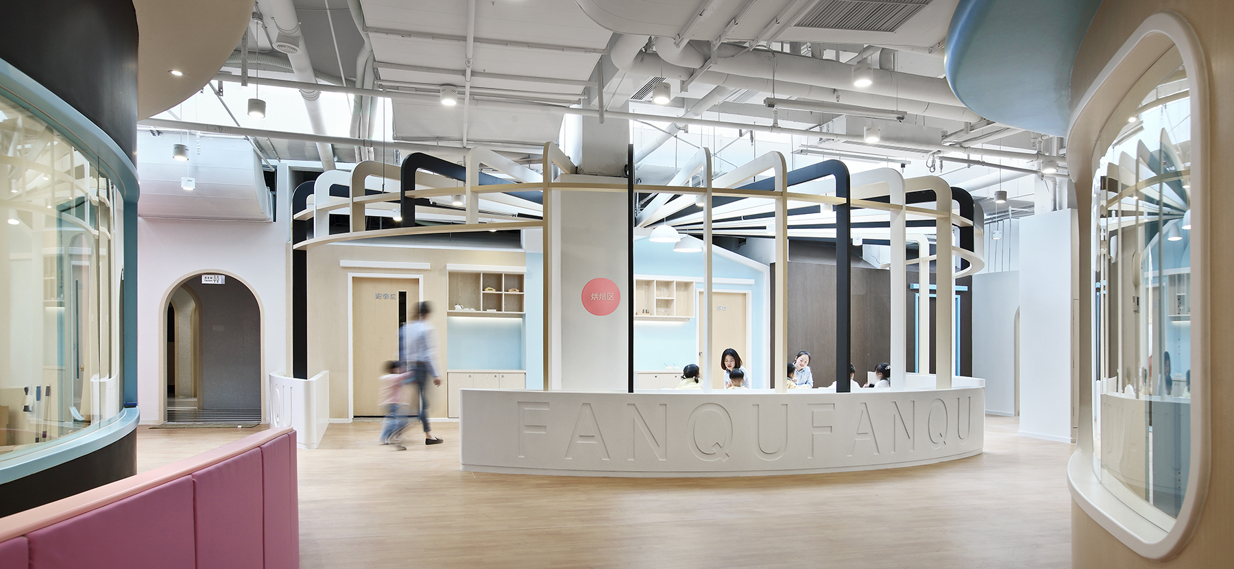 設(shè)計(jì)師延伸“番趣”的品牌形象,打造項(xiàng)目主入口外觀,品牌元素與園區(qū)的展示需求相融合,構(gòu)成明凈活潑的外觀形象。門頭和前臺造型取自品牌“F”元素,以親切的姿勢歡迎小朋友和家長的到來。