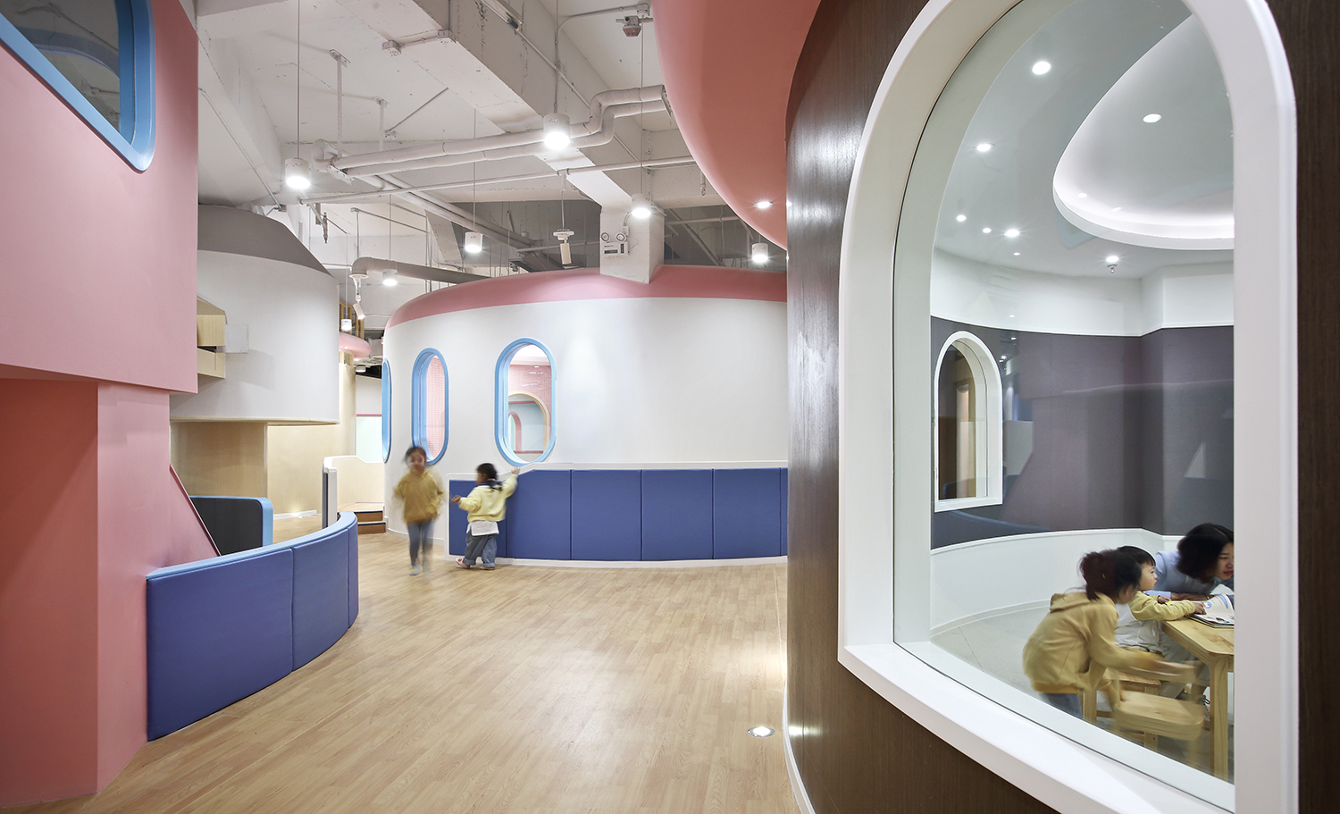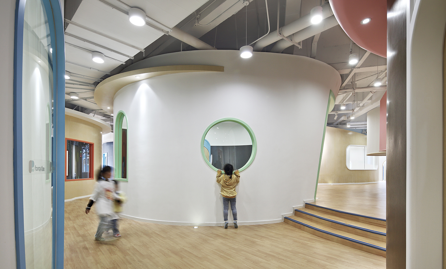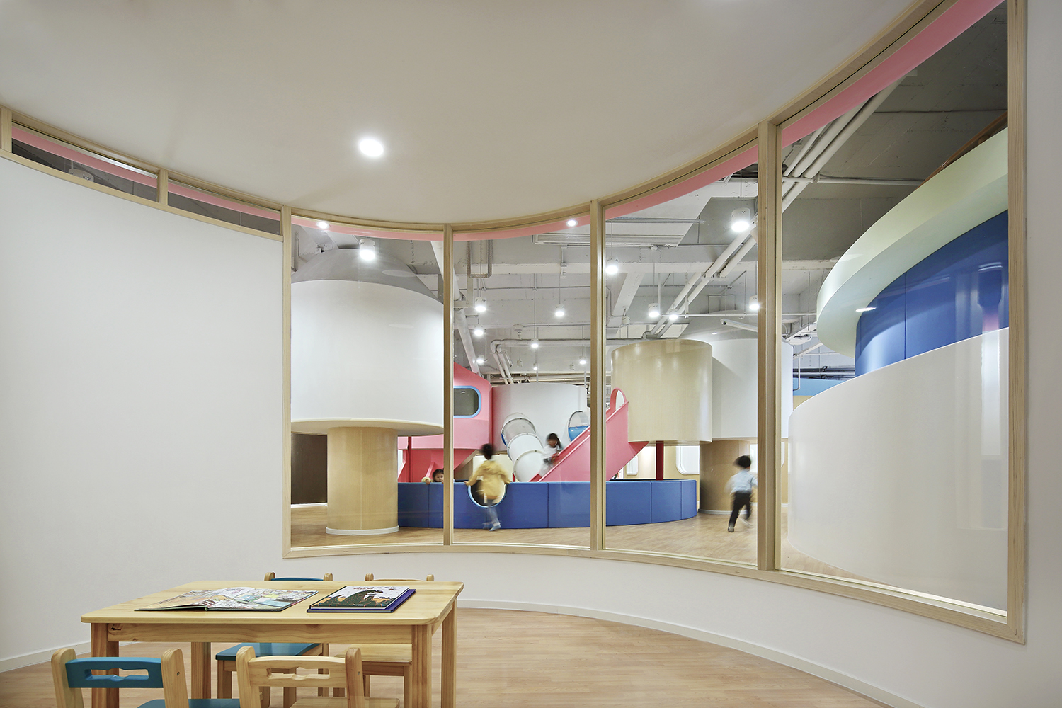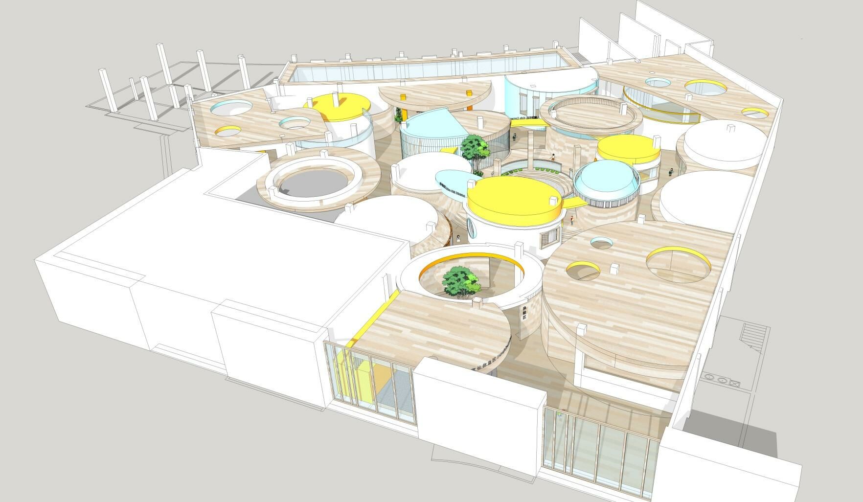 進(jìn)入兒童成長中心內(nèi)部,一幢幢可愛的圓形房子矗立眼前,開闊的走道四通八達(dá),讓人豁然開朗。
