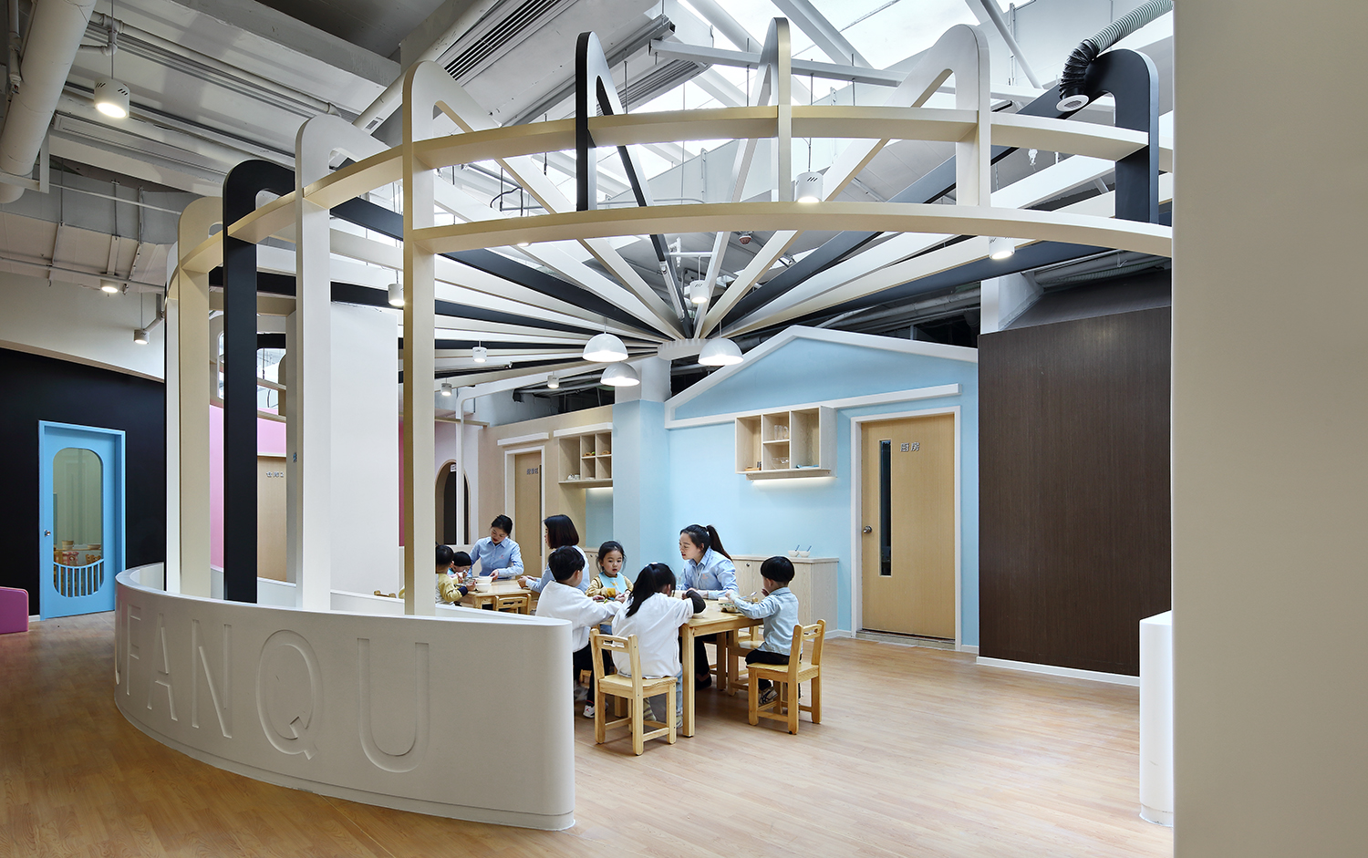 設(shè)計(jì)師將室內(nèi)采光最充足的區(qū)域留給餐廳、繪本區(qū)等公共區(qū)域,同時(shí)打造開放感,以此盡量延展陽光在成長中心的照射范圍。當(dāng)陽光進(jìn)來,仿佛天燈將整座城市點(diǎn)亮。孩子們能夠在陽光下活動,吃飯、讀書、玩樂,隨著時(shí)間的變化觀察光影,感受陰晴雨雪和四季變化。