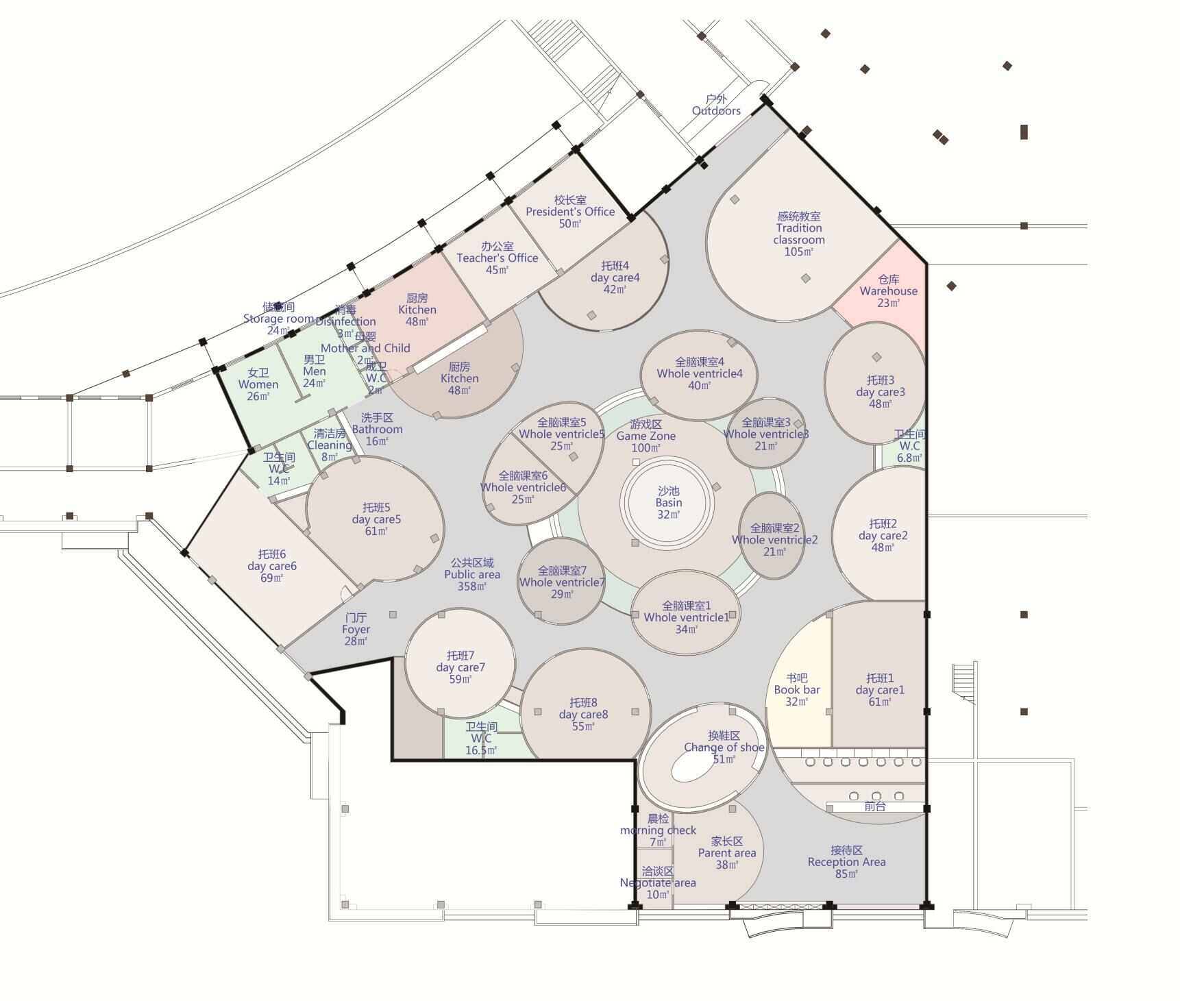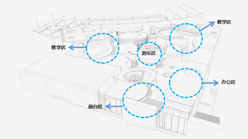 此次設(shè)計(jì)涉及早教和托育兩大版塊功能需求,包括16間教室、1個游樂區(qū),以及書吧、辦公區(qū)、廚餐區(qū)等。設(shè)計(jì)師將原有場地進(jìn)行清理和重新分割,根據(jù)項(xiàng)目需求和場地情況將中部規(guī)劃為早教區(qū),托育教室則圍繞早教區(qū)環(huán)形安置,主門在南面,接送門在西側(cè)。