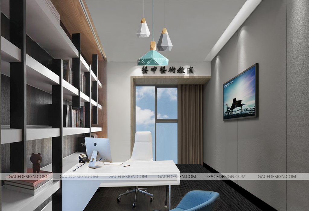 幼兒園空間的天窗位置及中心的倆個入口特在走廊區域加重設計內容,使得天窗的自動窗簾,走廊半圓形暗藏燈帶吊頂,走廊墻面不規則造型可視窗和弧形的墻體及地面的塑膠地板和綠植相互結合呼應,使兒童在接受教育的同時還有接近自然的感覺,辦公區設在中心的靠門位子把采光好的地方留給教室使在中心受教育的兒童有足夠的光線,充分體現中心已兒童為中心的理念。衛生間的墻體改動存分的利用現有空間達到對空間的合理利用。